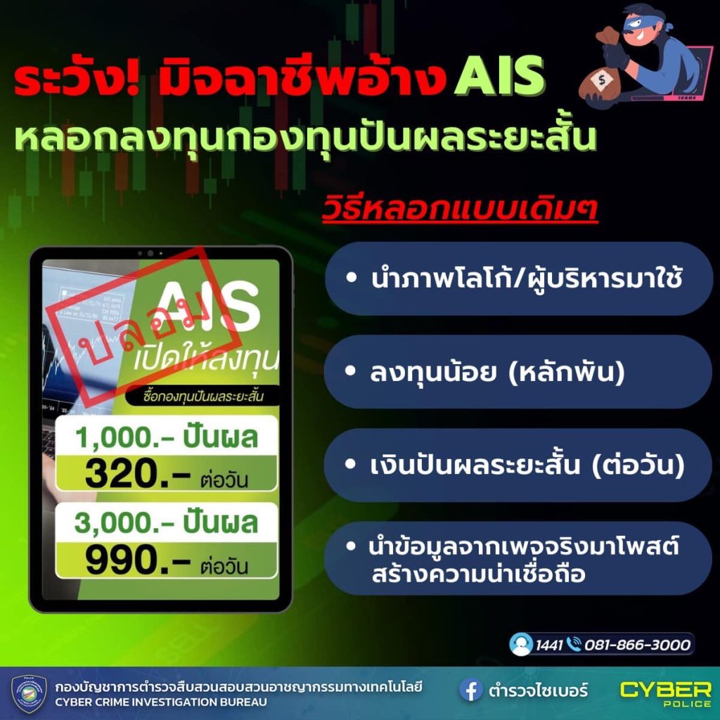 มิจฉาชีพสร้างเพจปลอม นำภาพผู้บริหาร และโลโก้ของบริษัท AIS ไปโฆษณาชักชวนลงทุน ใช้แนวทางแบบเดิมๆ ในการหลอกลวง แต่เปลี่ยนชื่อบริษัทเรื่อยๆ ให้ประชาชนสังเกตพฤติกรรมที่เข้าข่ายกลโกงของมิจฉาชีพ มักจะมีการชวนลงทุนแบบปันผลระยะสั้น ลงทุนขั้นต่ำหลักพัน แต่หลอกล่อด้วยผลตอบแทนรายวันสูงถึง 30%